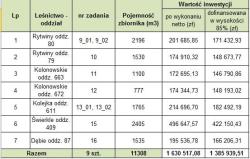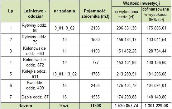 Nadleśnictwo Zawadzkie zrealizowało 10 zadań polegających na budowie/modernizacji zbiorników w leśnictwach: Krupski Młyn, Zarzecze, Kolejka, Mosty, Dębie, Łaziska, Świerkle i Kolonowskie. Zadania zostały zakończone i odebrane między 2019-2022 rokiem na łączną kwotę kwalifikowaną 5 566 908,60 zł.